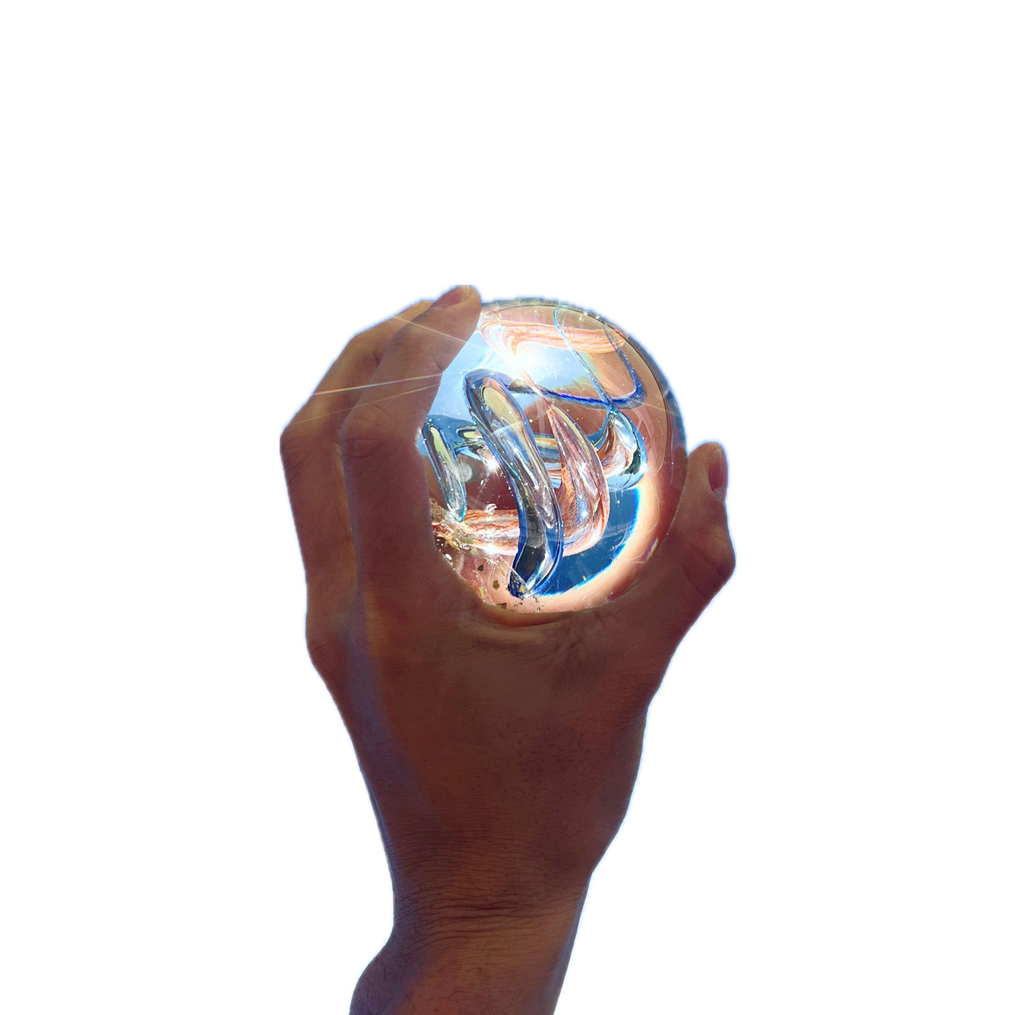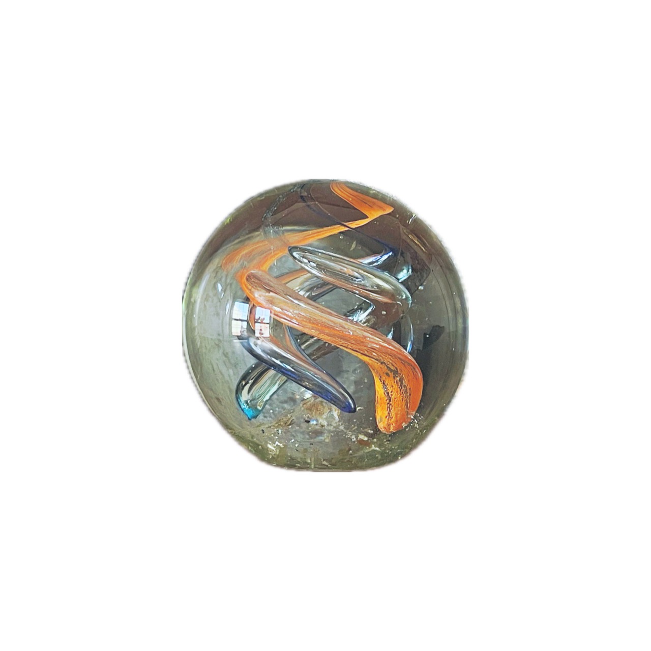 中でオレンジとブルーの螺旋が渦巻くガラスのペーパーウェイトです