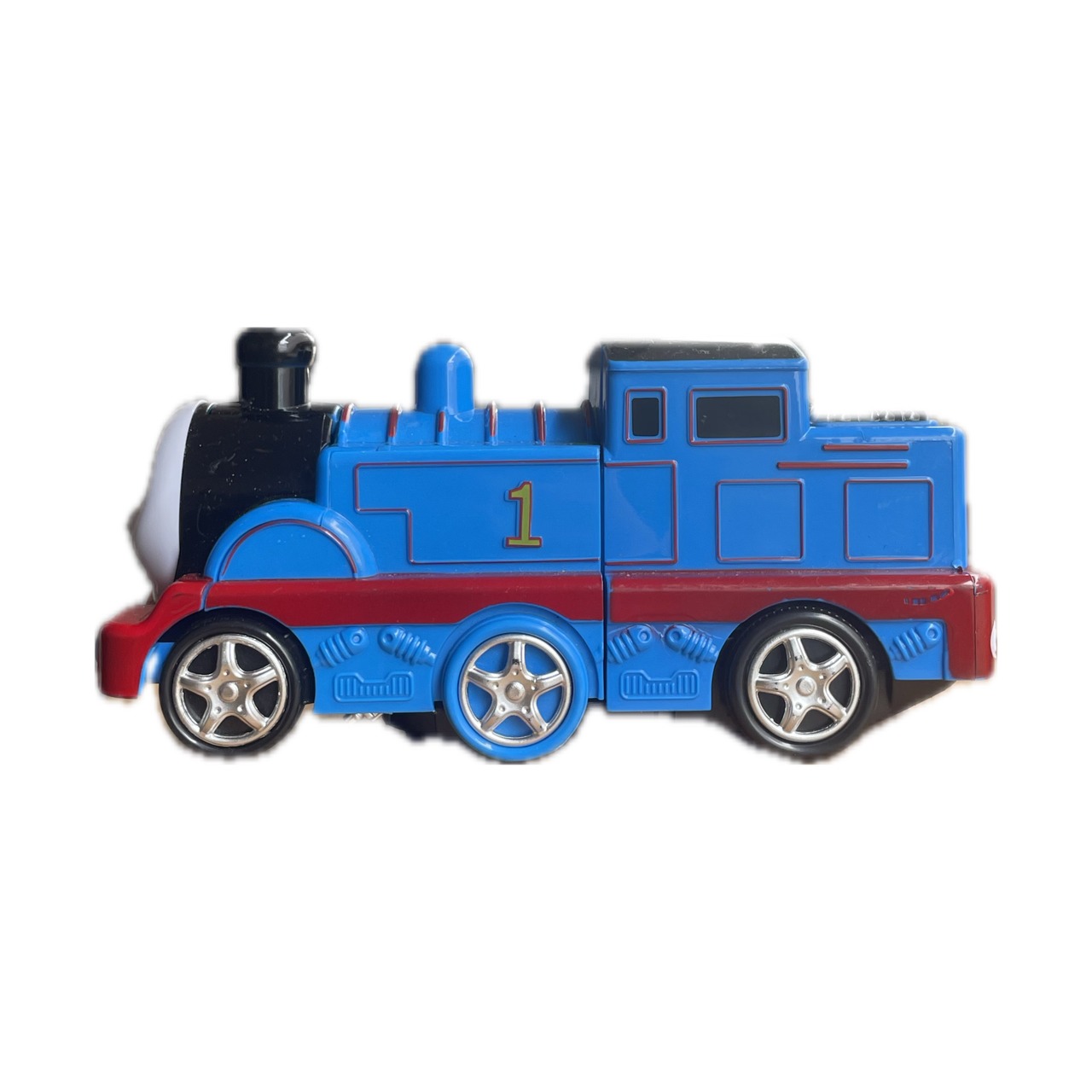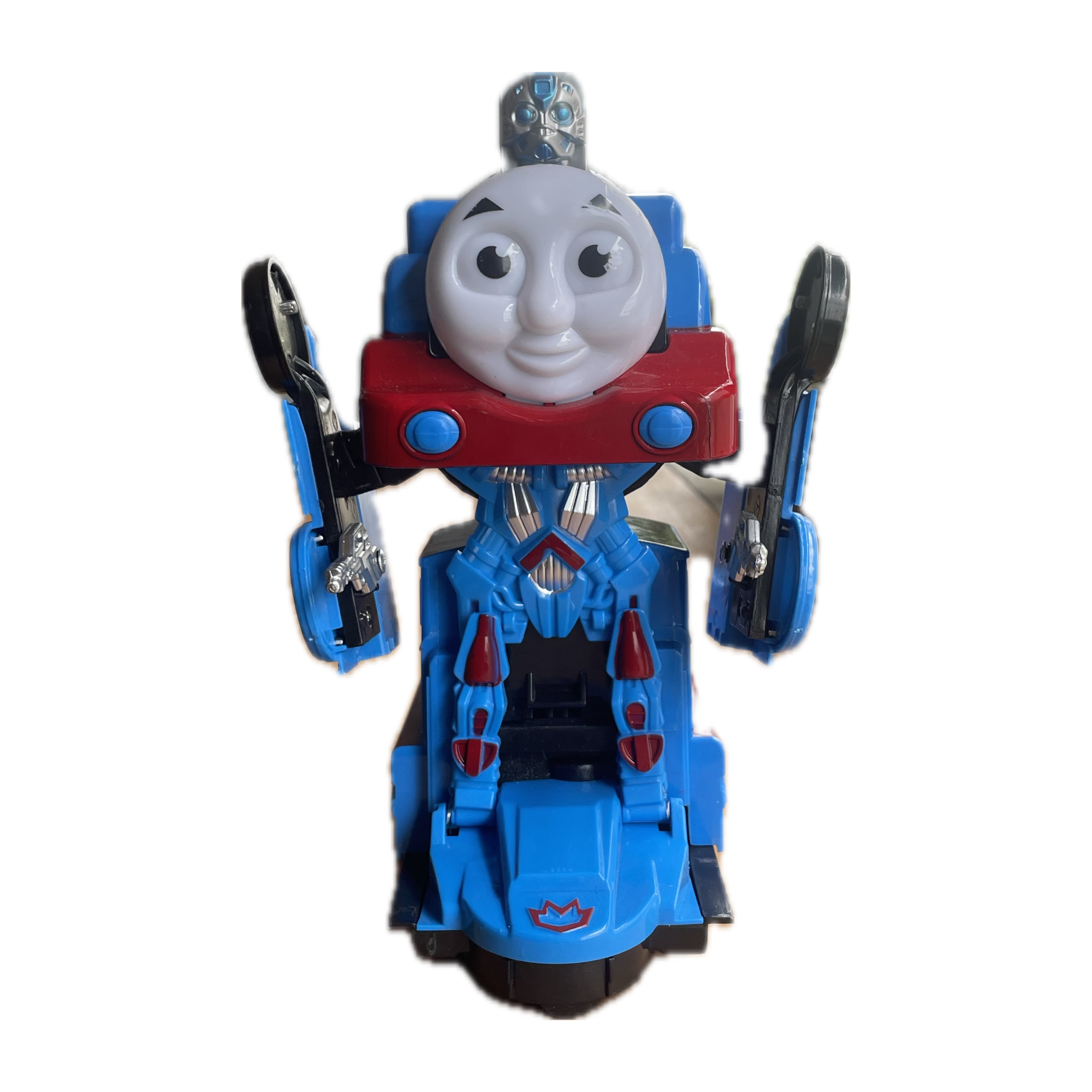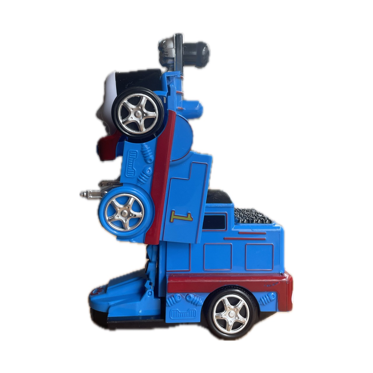 有名な機関車のキャラクターをモチーフにしているが、電池を入れると音を出しながらトランスフォームします